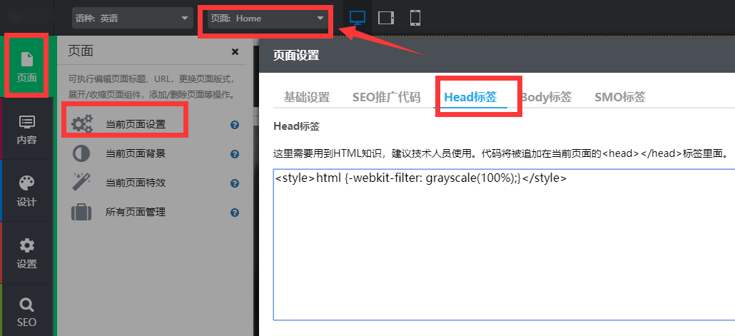 登录网站后台->编辑网站->编辑首页->页面->当前页面设置->切换到“Head标签”,添加如下代码,然后点击下方"确定",最后将网站“发布”即可。如下图所示: