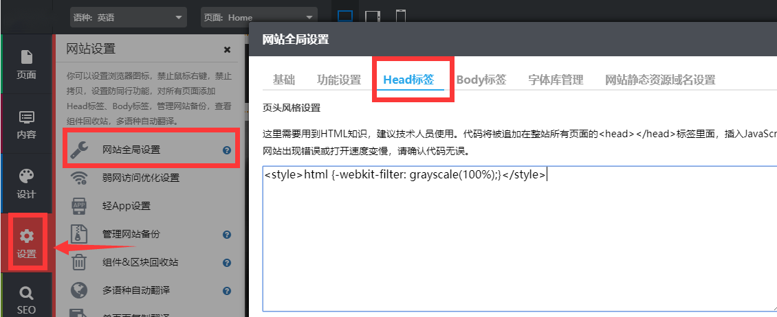 登录网站后台->编辑网站->设置->网站全局设置->切换到“Head标签”,添加如下代码,然后点击下方“确定”,最后将网站“发布”即可。如下图所示: