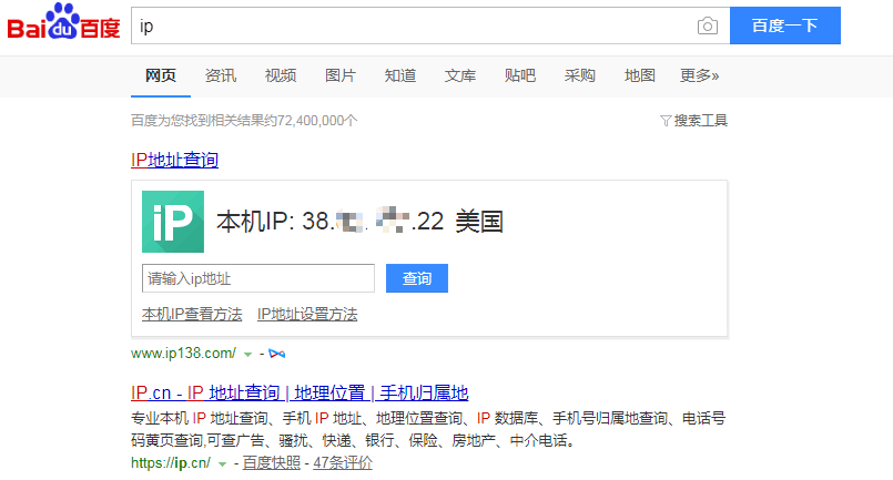 第1种情况:打开百度,在百度搜索框里输入“IP”,单击“百度一下”,在搜索结果中如下图所示的这一条,可以查看到IP地址是国内还是国外,如果是国外,即是已FQ状态(如下图所示)。