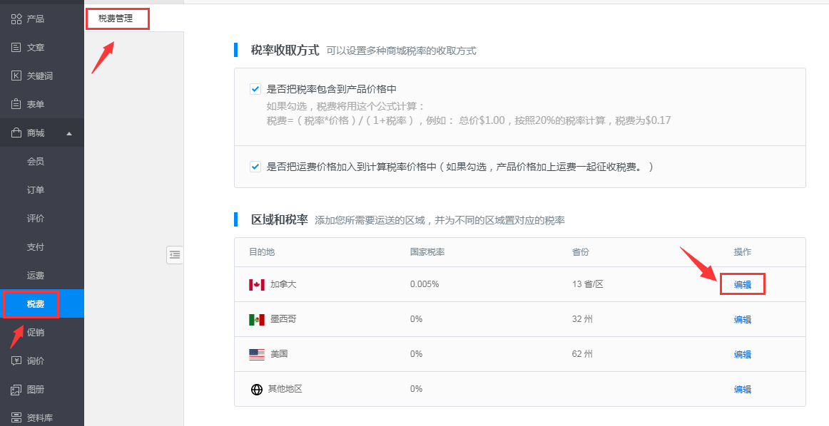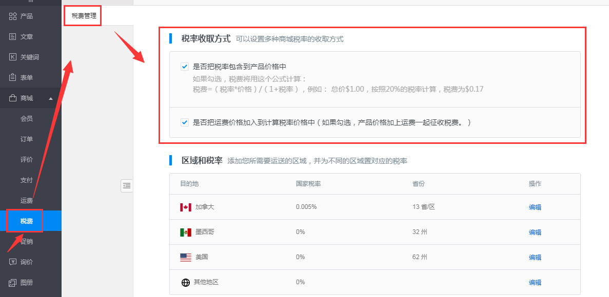 二、商城网站税费系统主要功能介绍及编辑入口