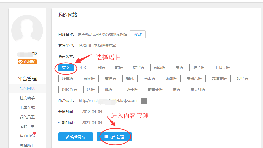 (3)找到商城网站,单击“内容管理”;