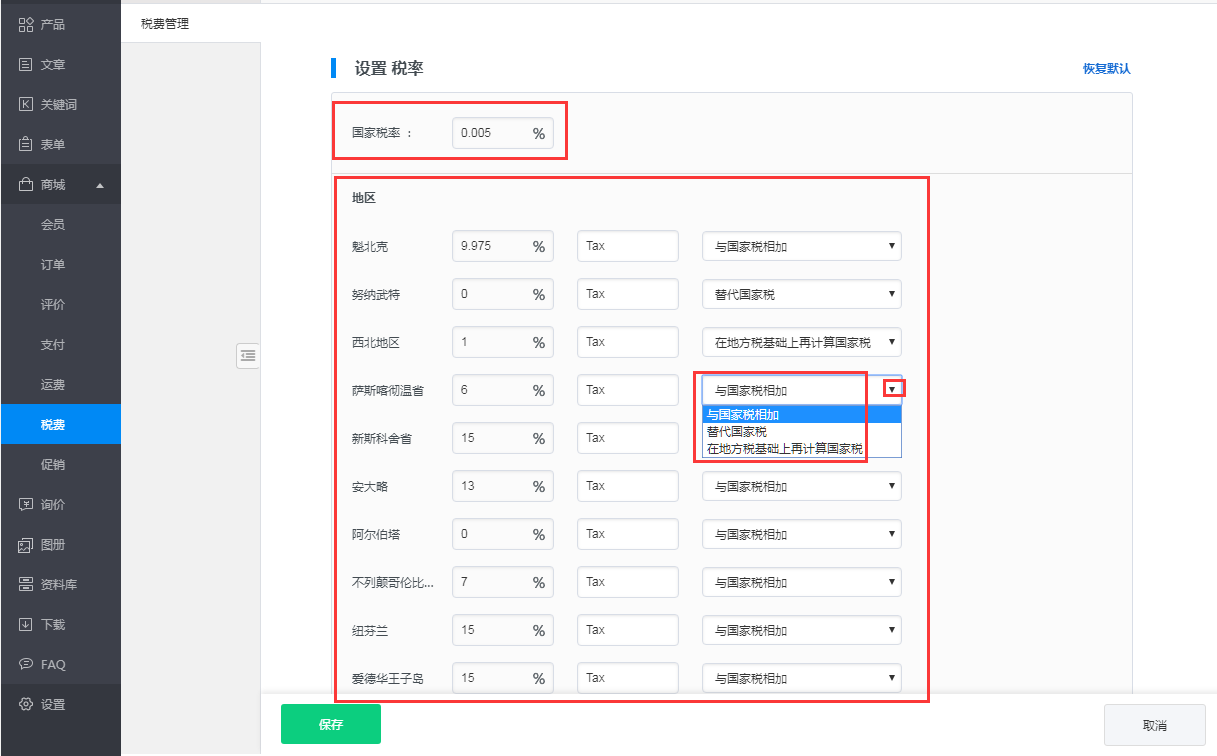 (1)这里的区域同运费设置中的区域保持一致,建议先在运费系统中设置支持运送的国家和地区,然后在税费的区域设置中设置对应区域的税率,如下截图所示界面: