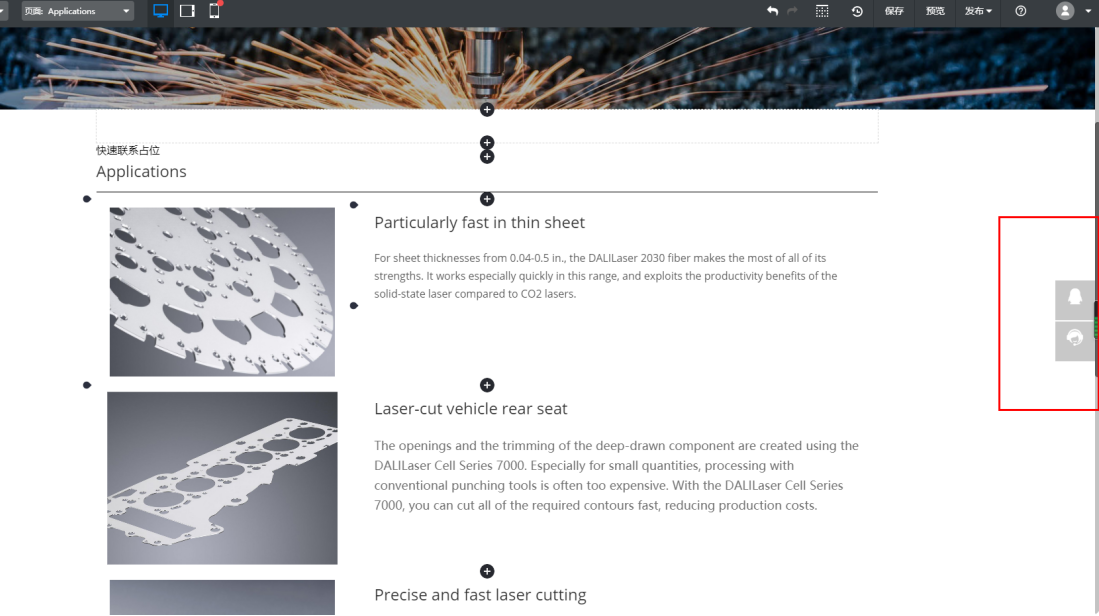 提示:“快速联系占位”的文字只是在页面中占一行,提示添加了“快速联系”组件,实际该组件显示的位置与设置的展示风格、浮动位置有关。