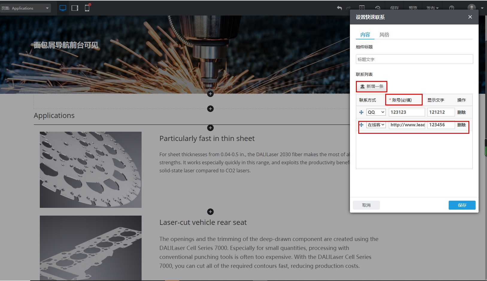 Step2:在弹出的“设置快速联系”中,如果您已经有其他的联系方式如QQ等,需要点击“新增一条”,然后在联系方式的下拉菜单中找到“在线客服”,账号为必填项,账号填入内容为第三方客服的链接地址,显示文字填入您需要填的内容,在风格中选择合适的样式与配色,颜色需要在自定义中更改。