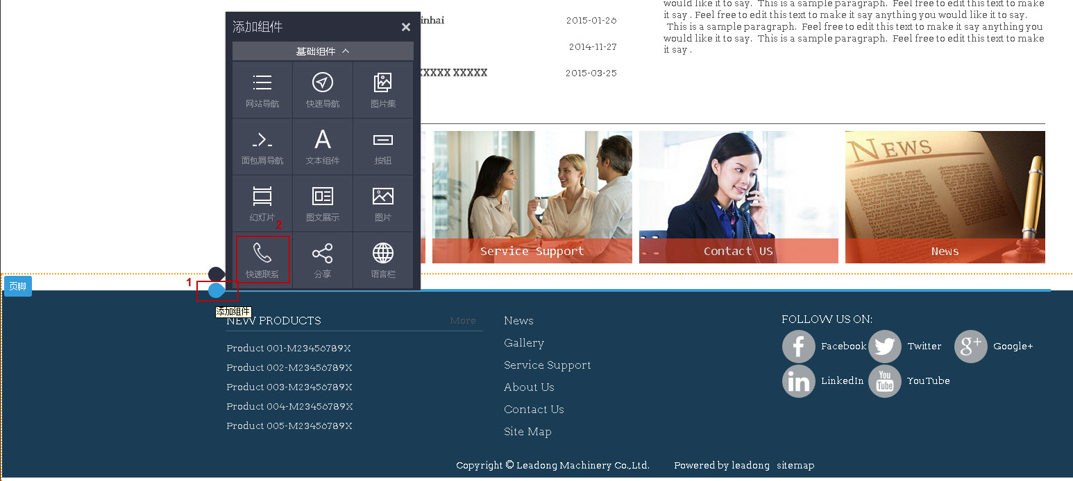 第二步:添加的“快速联系”组件,在页脚域名只是一个占位,找到这个组件占位,把鼠标放到下图1区域,然后出现齿轮装图标,把鼠标放在此图标上,出现右侧一排功能按钮,单击3设置按钮;