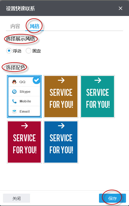 在网站上添加QQ、Skype、Email、Tel这些联系方式目的是方便客户及时、快读联系到您,这些联系方式可以固定显示在某个位置,也可以浮动显示,并且有多种展示风格供您选择。