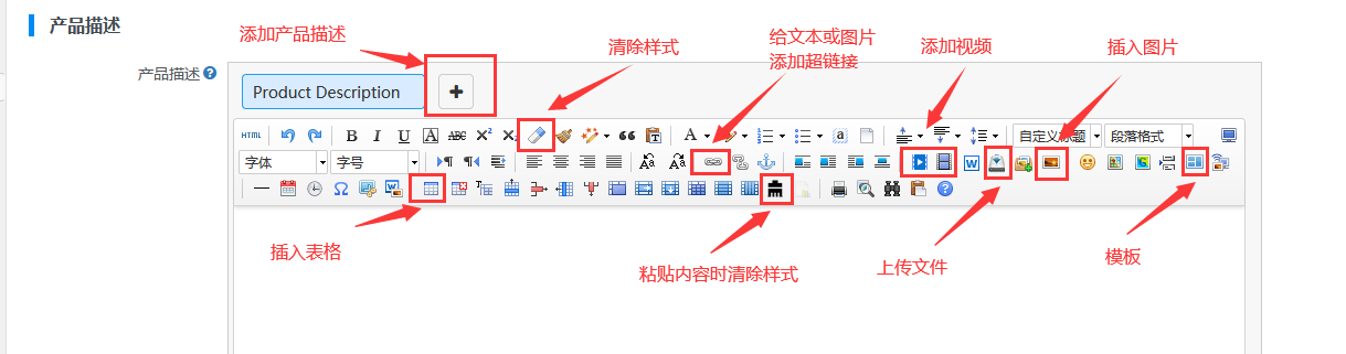注:产品描述最多可以添加5个,里面功能比较多,可以添加图片、文本、链接、视频等,粘贴文本要清除原有的格式;