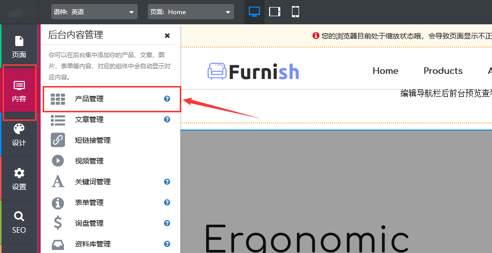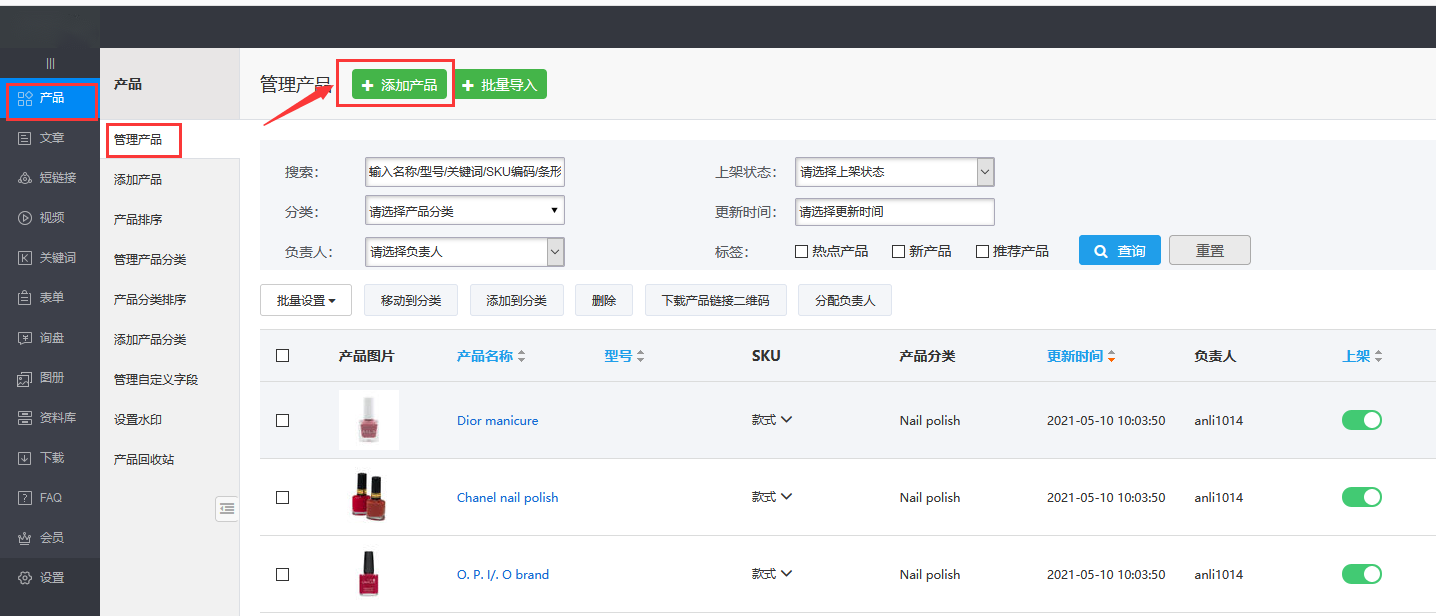 第一步:单击后台中的“内容”》“产品管理”》,然后单击“添加产品”按钮;
