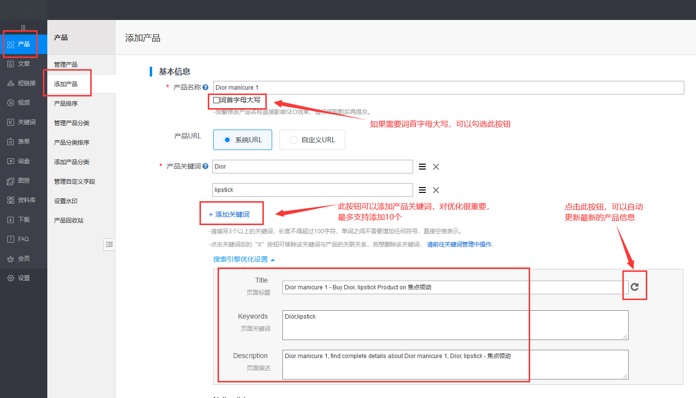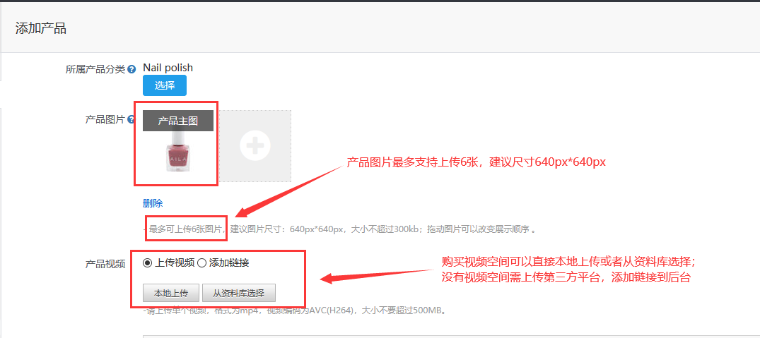 第二步:按照页面指引填写产品名称、产品关键词、选择所属产品分类、上传产品图片、产品视频等相关信息;
