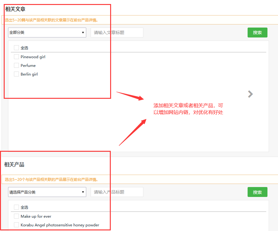 其中,相关文章功能介绍:如果关联了某些文章,需要这些文章在这个产品详情页面出现,还需要在产品详情页面添加“相关文章组件”才可以。