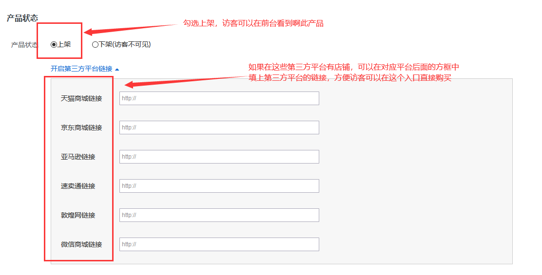 注:产品属性在前台是文本形式展示,如果属性名称不符合您的业务场景需求,可以在添加自定义字段中设置;