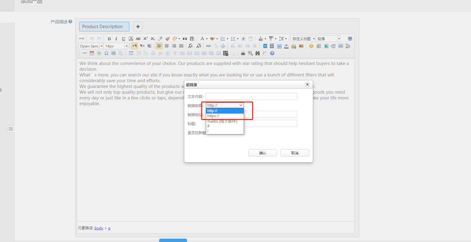 文字与图片都支持添加超链接,选中您要添加超链接的文字与图片之后点击超链接按钮,链接前缀根据网站实际情况选择http或者https,为了提升用户体验建议勾选“是否在新窗口打开”
