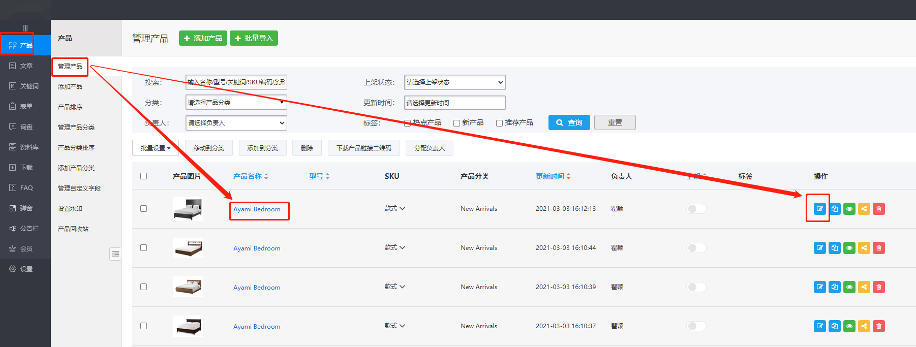 Step1:点击页面左侧的"内容",选择"产品管理"
