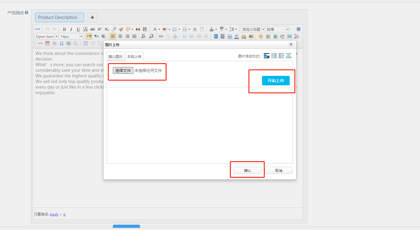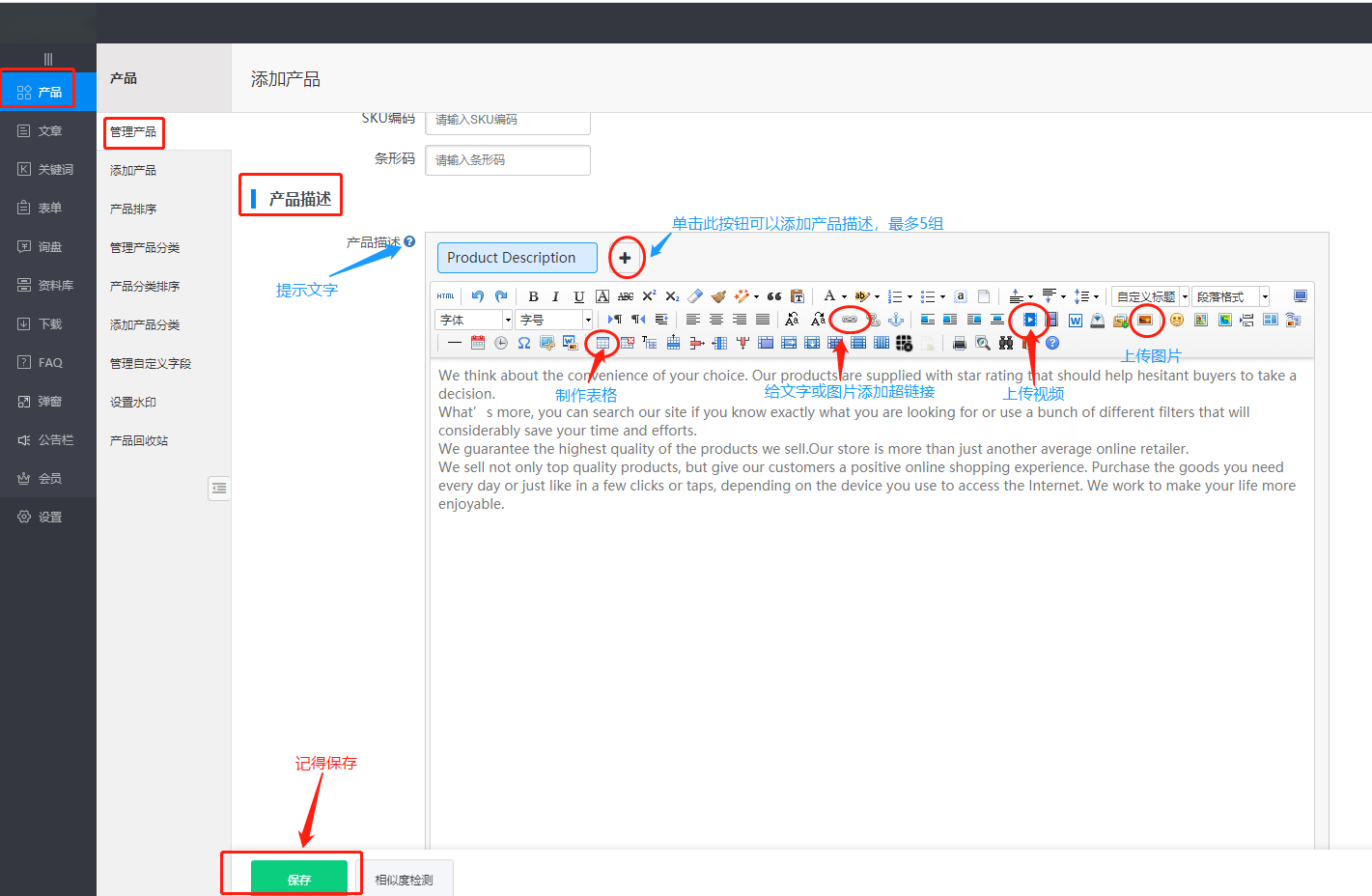 Step3:在出现的页面下滑找到"产品描述",产品描述的富文本编辑器功能满满,几个常用功能如下图所示,您也可以动动小手探索其他功能。