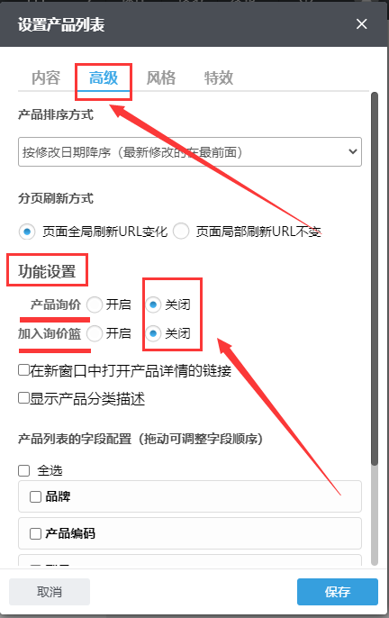 二、在设置产品列表这里选择“高级”,下方功能设置中的“产品询价”“加入询价篮”处均点击“关闭”,设置完风格后点击“保存”即可