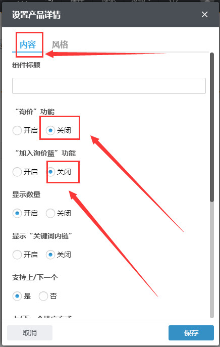 四、在设置产品详情内容这里,询价功能点击“关闭”,加入询价篮点击“关闭”,设置完风格后,点击“保存”即可