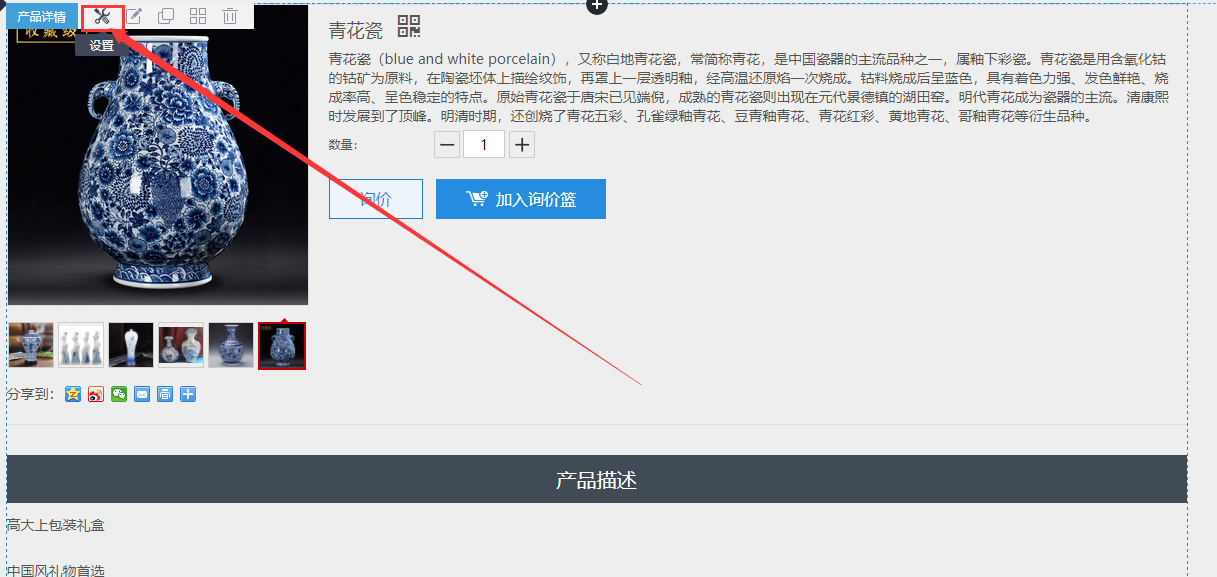三、对于已有的产品详情组件的,鼠标悬停在组件的上方,点击蓝色组件名称旁边的设置按钮