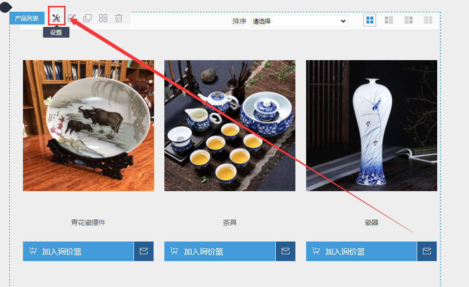一、对于已有的产品列表组件的,鼠标悬停在组件的上方,点击蓝色组件名称旁边的设置按钮