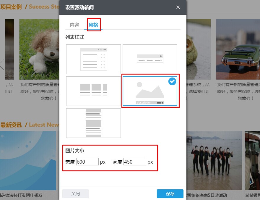 3.5 设置好滚动文章组件的内容、风格以及高级功能后,单击设置框右下方“保存”按钮,以保存所设置的内容。