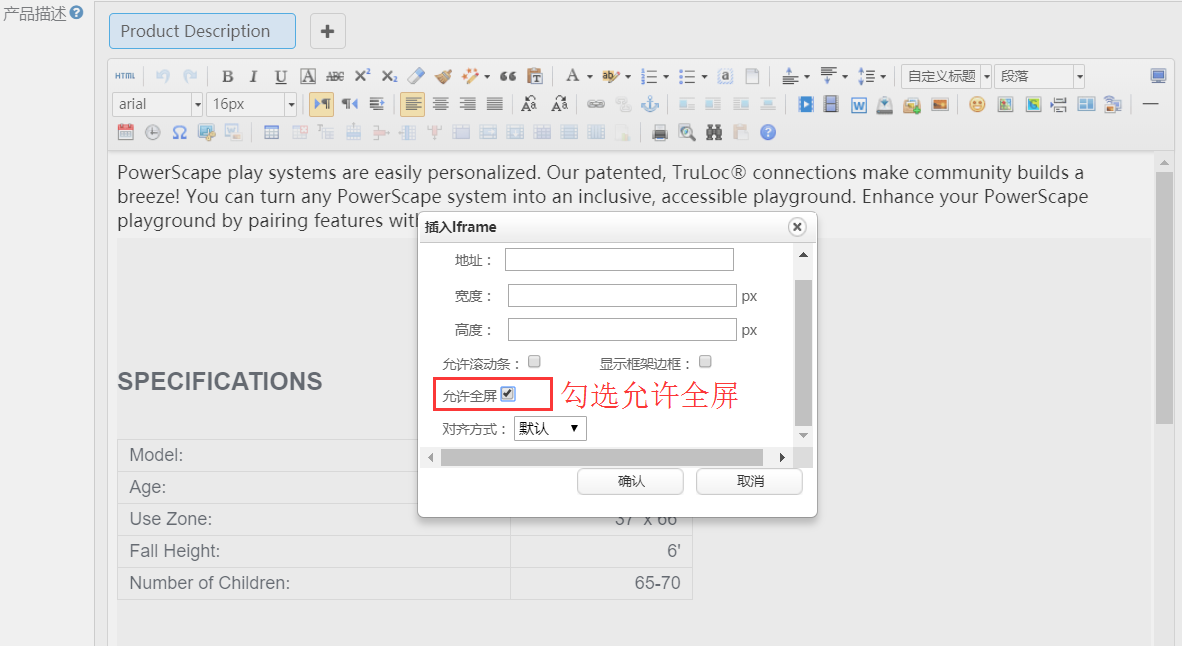 第3步:在产品描述中,通过插入Iframe按钮(如下图所示)插入视频,在弹出的“插入Iframe”对话窗口,输入从优酷或youtube获取的通用代码、输入视频显示的宽度和高度,视频图片直接显示第三方平台上的图片。不需要发布网站,前台即可同步。虽然在此处设置了视频的宽度和高度,但到手机上是可以自适应终端大小的。