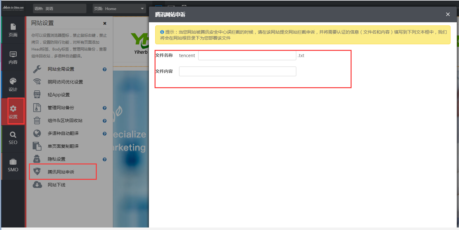 第2步.进入支点后台,点击设置==》腾讯网站申诉==》填写文件名称和文件内容