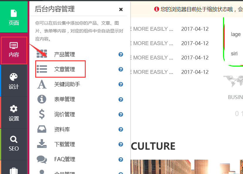 管理文章操作入口:编辑页面->内容->文章管理->管理文章