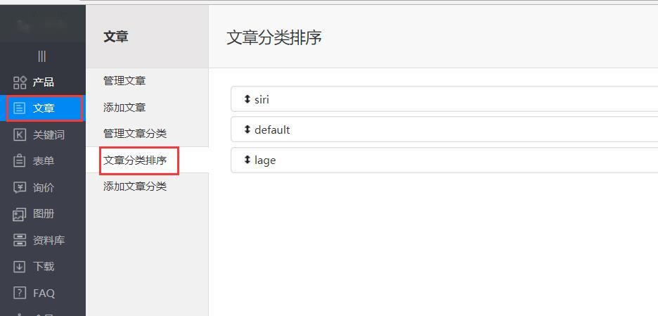 文章分类排序操作入口:编辑页面->内容->文章管理->文章分类排序