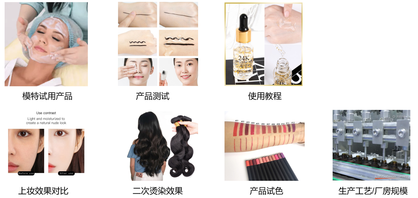 模特试用产品、产品测试、使用教程、上妆效果对比(彩妆类)、二次烫染效果(假发、假睫毛类)、产品试色(彩妆类)、生产工艺/厂房规模