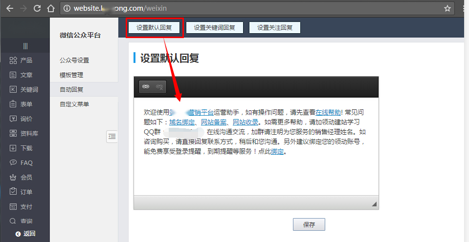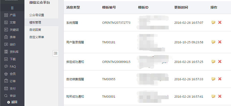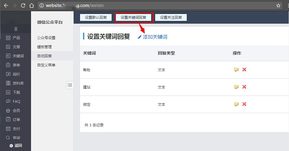第3步:在网站后台可以进行模板管理、设置自动回复内容、设置自定义菜单。