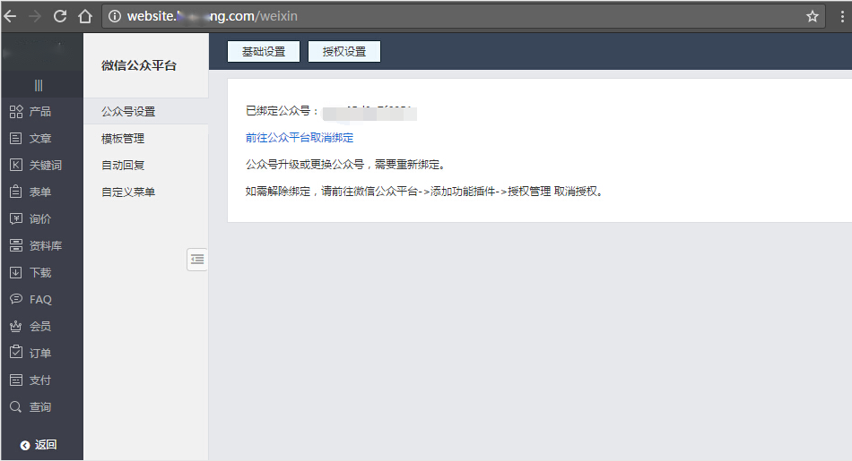 切换到“授权设置”,显示如下主界面,提示如果需要解除绑定,请前往微信公众平台->添加功能插件->授权管理取消授权;