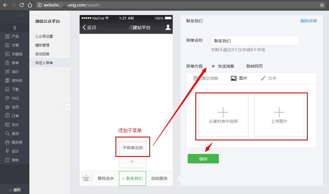 1)菜单内容有两种形式:即单击菜单时可以发送消息,也支持跳转到网站上的某个页面,因为使用领动所建的网站是响应式网站,在手机上可以直接友好访问,所以建议可以直接将微信的自定义菜单与网站页面关联;