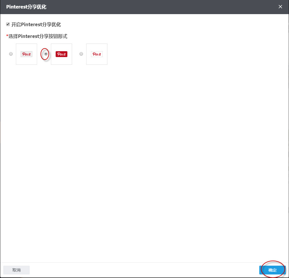第二步:勾选“开启Pinterest分享优化”按钮,然后选择Pinterest分享按钮形式,然后单击“确定”;