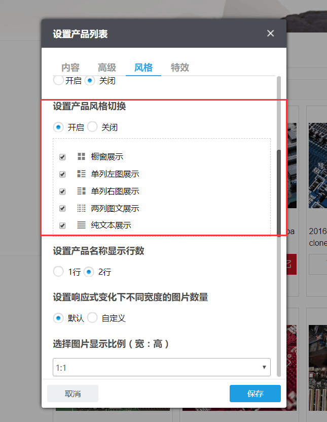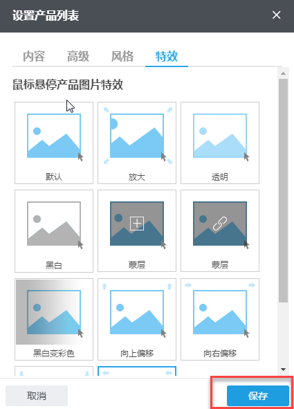 3)设置好产品列表组件的内容、高级功能、风格和特效后,点击右下方“保存”按钮,保存所设置的内容。