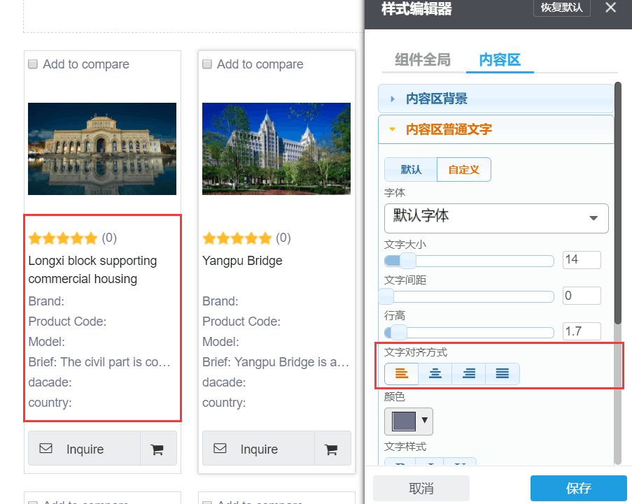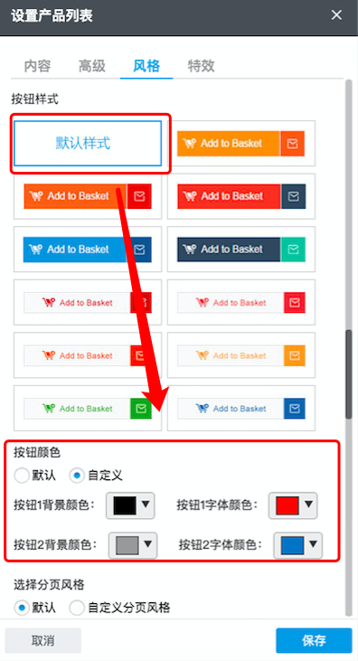 9、“产品列表”组件,选择”默认样式“后可自定义“产品询价”及“加入询价篮”按钮样式;