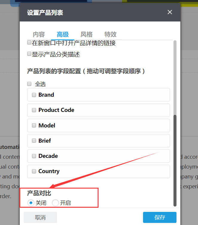 产品列表的字段配置:有时客户需要在产品图片和名称下面显示这些字段,那么我们就可以在这里勾选要显示的字段,并且可以拖动调整字段顺序;