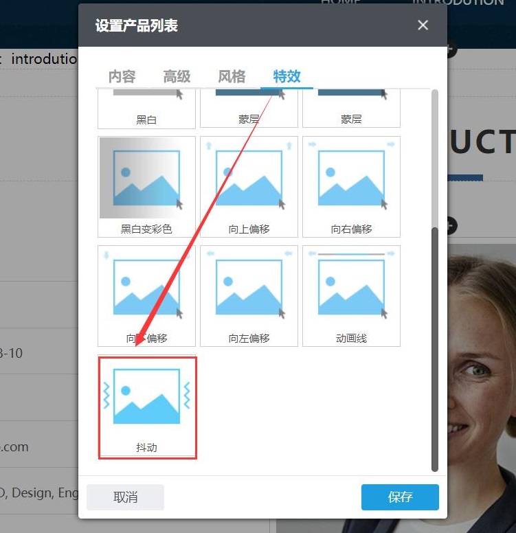(1)新增功能应用场景:组件新增“抖动”特效,鼠标悬停到产品图片上出现抖动效果;