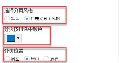 ● 分页风格,可以设置默认,也可以自定义分页风格,可以自定义分页按钮中颜色,也可以选择分页位置居左、居中或者居右。