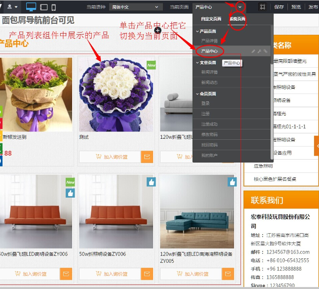 系统页面中的产品中心页面通常已经添加好了一个产品列表组件,直接根据需要对这个组件进行相应操作就可以。