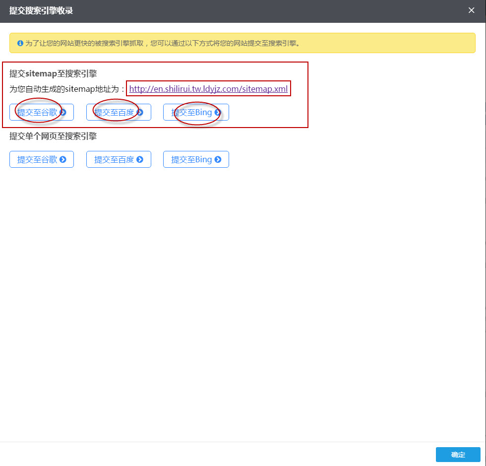 2、在提交搜索引擎收录窗口,您可以把系统为您自动生成的sitemap地址提交至谷歌、百度、Bing搜索引擎;