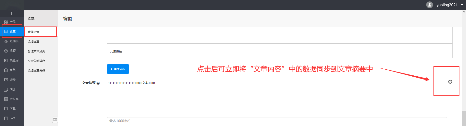 内容管理后台——文章管理——添加文章/编辑文章——文章摘要点击刷新,操作步骤如下: