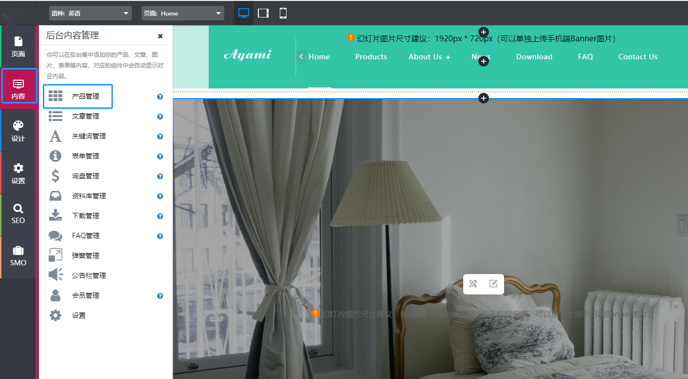 Step1:点击页面左侧的"内容",选择"产品管理"