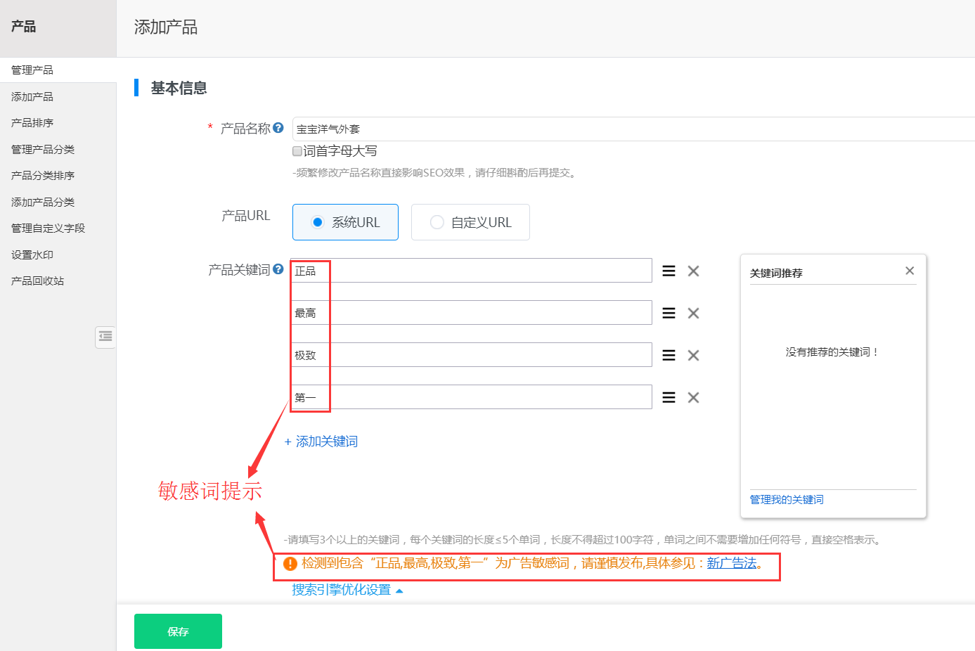 【应用场景】 为了响应《中华人民共和国广告法》的规定,方便客户在建设网站中能够准确判别敏感词,支点建站针对产品关键词,产品描述和文章关键词,文章内容等多处地方新增广告法敏感词过滤功能。