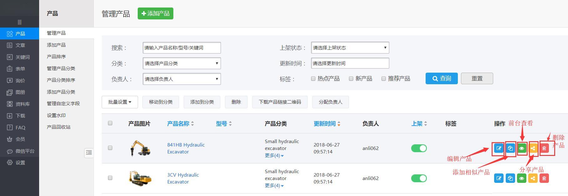 产品管理支持对产品做以下操作:上架或下架、设为或取消最新/热销/推荐标签、给产品换个产品分类(移动到分类)、设置某个产品属于多个分组(添加到分类)、下载产品链接二维码、分配负责人、编辑/删除/分享产品、添加相似产品、获取某个产品的网络访问地址。