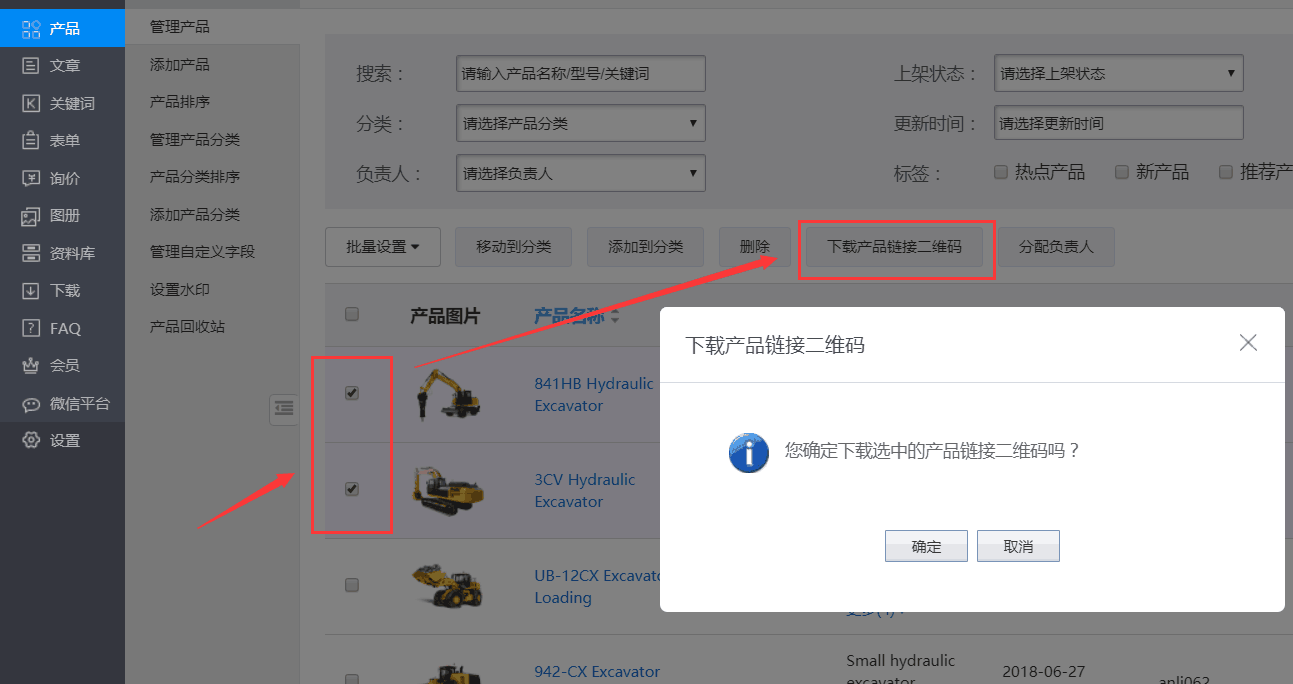 选择需要下载二维码的产品,点击下载产品链接二维码,点击确定。
