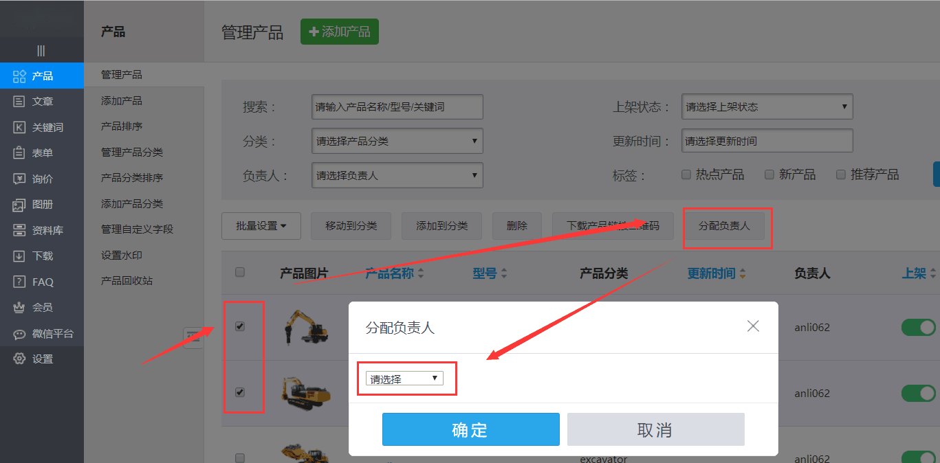选择需要设置的产品,点击分配负责人按钮,选择负责人,点击确定。