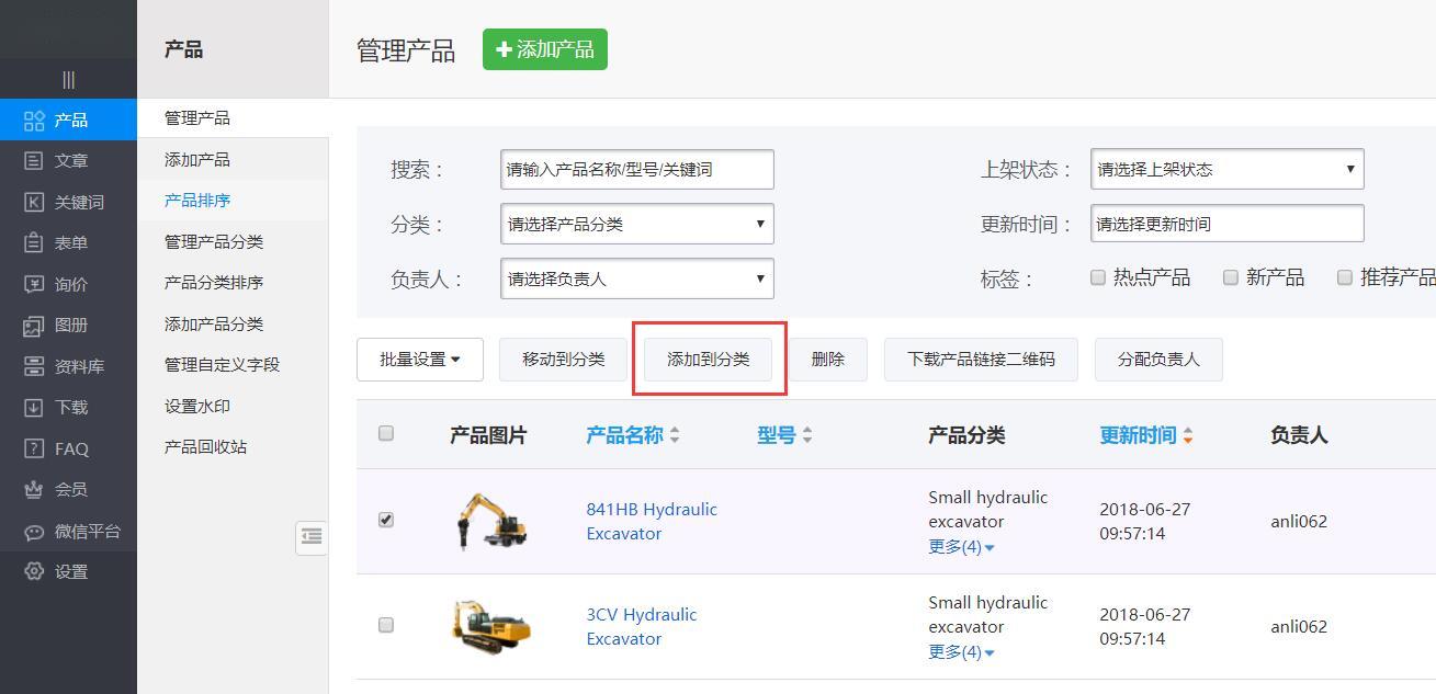3.添加到分类,选择需要设置的产品,点击添加到分类按钮