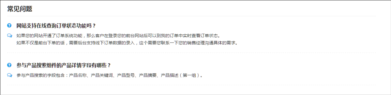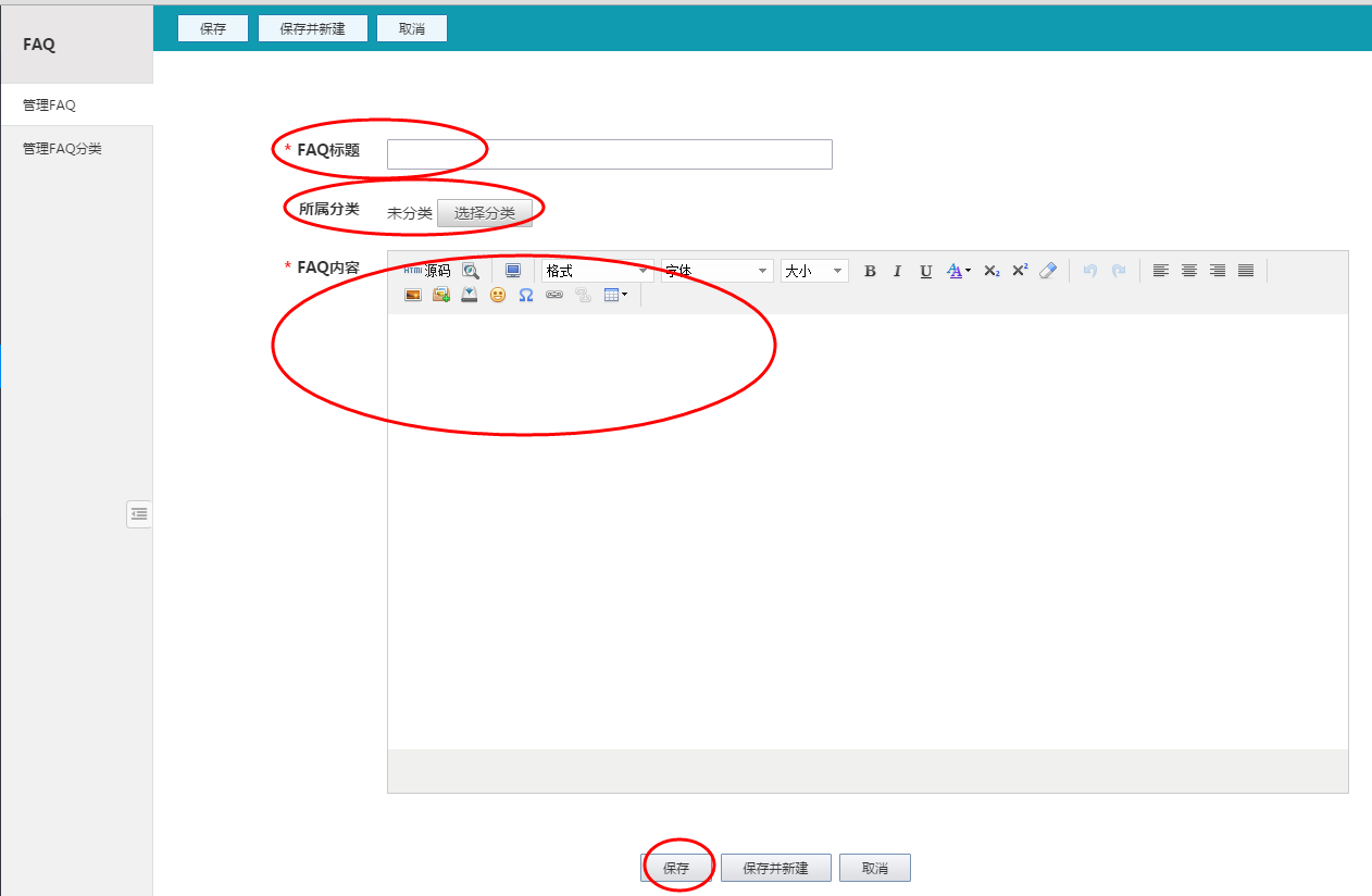 第3步:单击“添加FAQ”按钮,输入FAQ标题、选择所属分类,输入FAQ内容,然后保存;然后这条信息就会自动显示在网站前台;