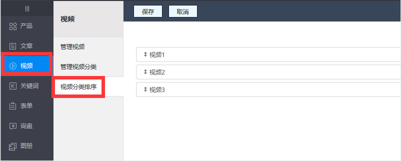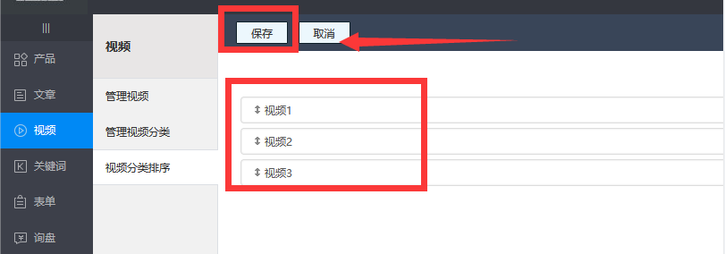 1、先进入内容管理后台—视频—视频分类排序,如下图所示: