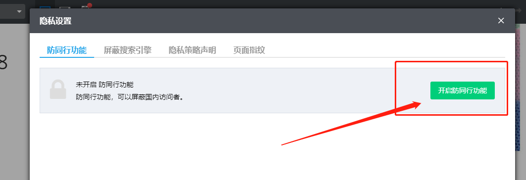 第二步:选择”隐私设置“里的”防同行功能“,点击绿色按钮“开启防同行功能“,如下图所示: