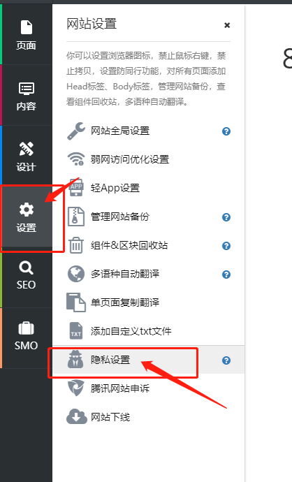 第一步:进入网站编辑后台,单击“设置”里面的“隐私设置”,如下图所示: